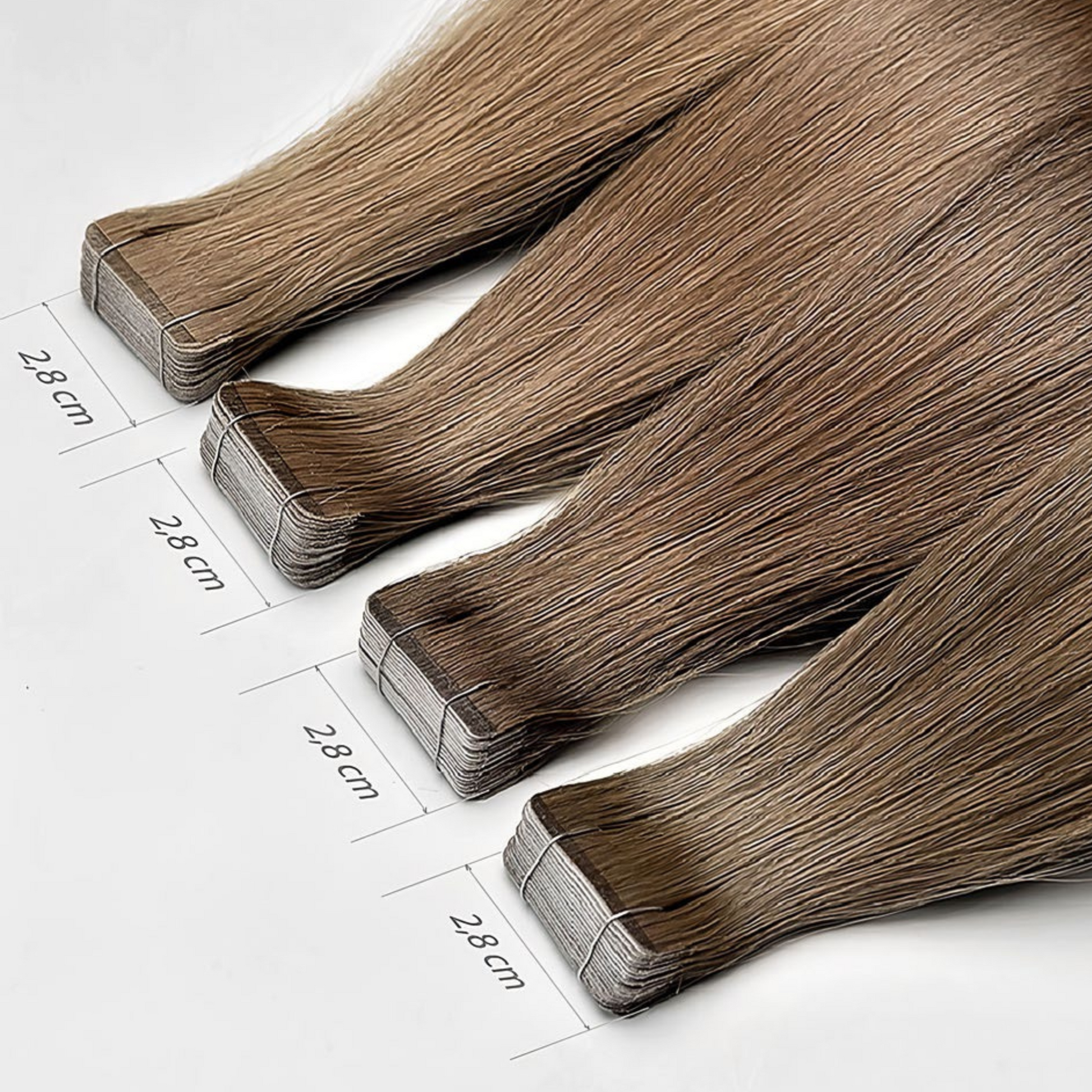 A tape-ek 2,8 cm szélesek, egy csomagban 20 db tincs található, ami 10 pár tincset jelent felhelyezve. Egy csomag saját hosszban dúsításra alkalmas, hosszabbításhoz minimum 3 csomag szükséges. Amennyiben úgy ítéled meg, hogy sok hajad van és/vagy egyhossz formára van vágva, az esztétikus végeredmény érdekében 4-5 csomag felhelyezését javasoljuk.